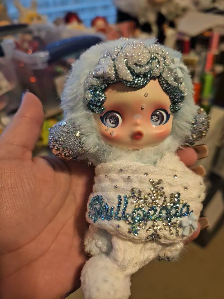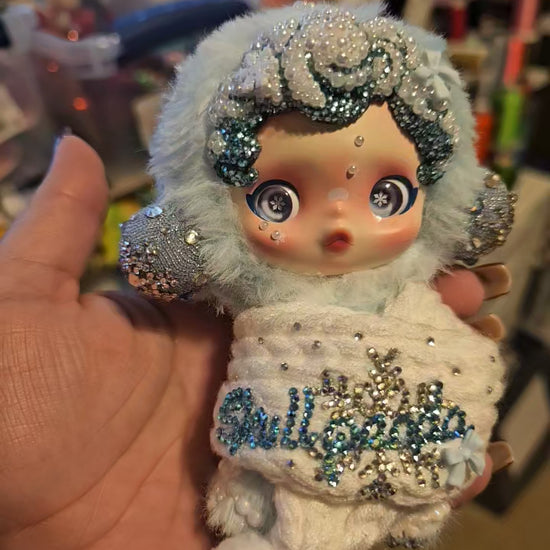 Introducing Song of Snow, a stunning hand-jeweled Skull Panda from the Winter Symphony series, elevated into luxury art through Bougie Bling Customs by Muffin Noodle Designs. This enchanting piece is adorned with meticulously placed premium crystals and pearl embellishments, creating a soft, icy shimmer that captures the magic of winter in every detail.